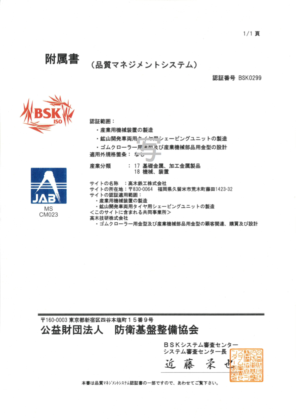 BSK0299(JIS Q 9001:2015):高木鉄工、高木技研